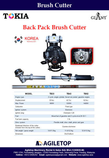 The Giant TB33, TB43, and TB52 Brush Cutters are powerful and reliable tools for tackling tough vegetation in agriculture and landscaping. Designed with durability and ease of use in mind, these models offer exceptional cutting performance for clearing grass, weeds, and dense undergrowth, making them ideal for maintaining large areas efficiently.