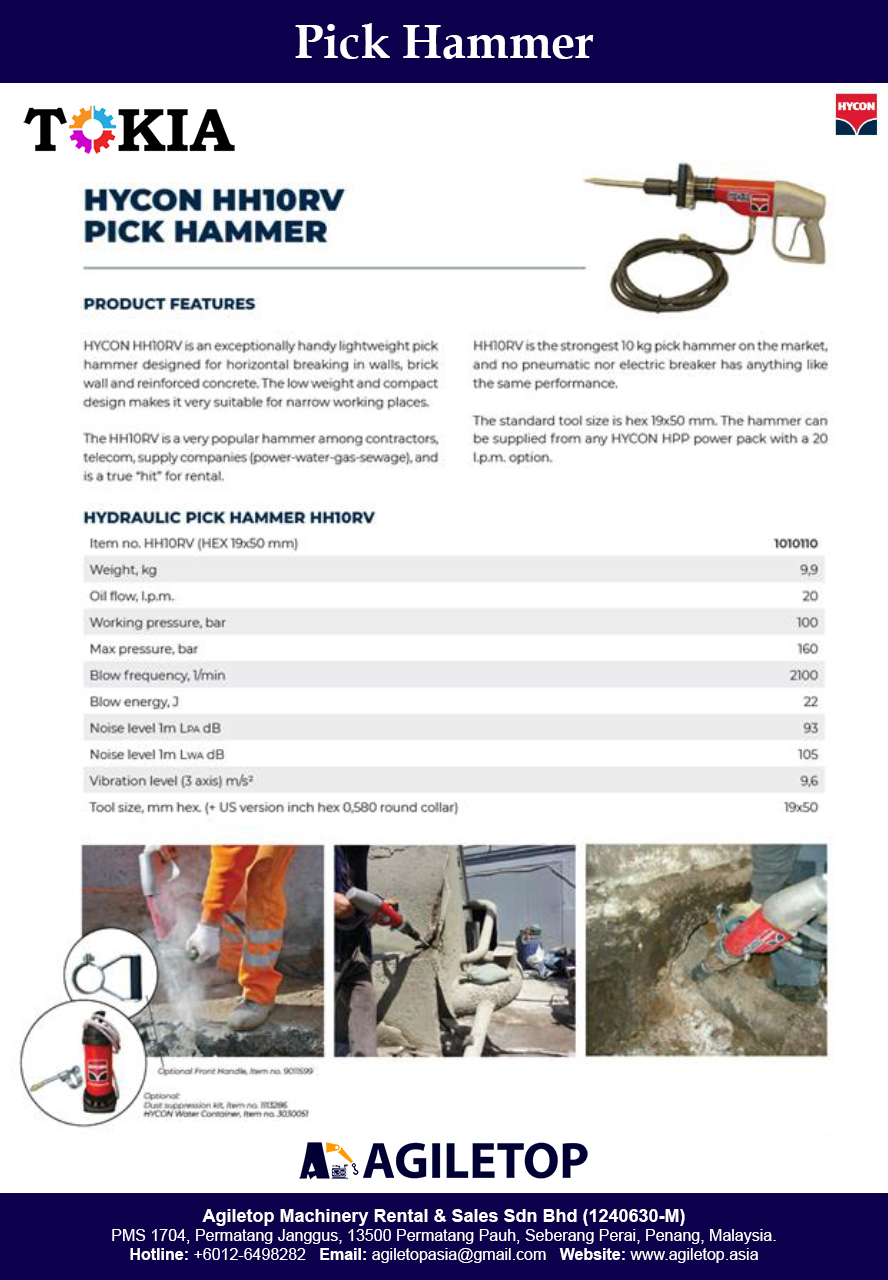 The Hycon HH10RV Hydraulic Pick Hammer is designed for precise and efficient demolition and breaking tasks. Its powerful hydraulic system delivers robust impact force, making it ideal for tackling tough materials like concrete and rock. The HH10RV features a durable construction and an ergonomic design that reduces vibration and noise, ensuring comfort and control during extended use. Suitable for heavy-duty applications, it combines reliability with high performance for demanding environments.
