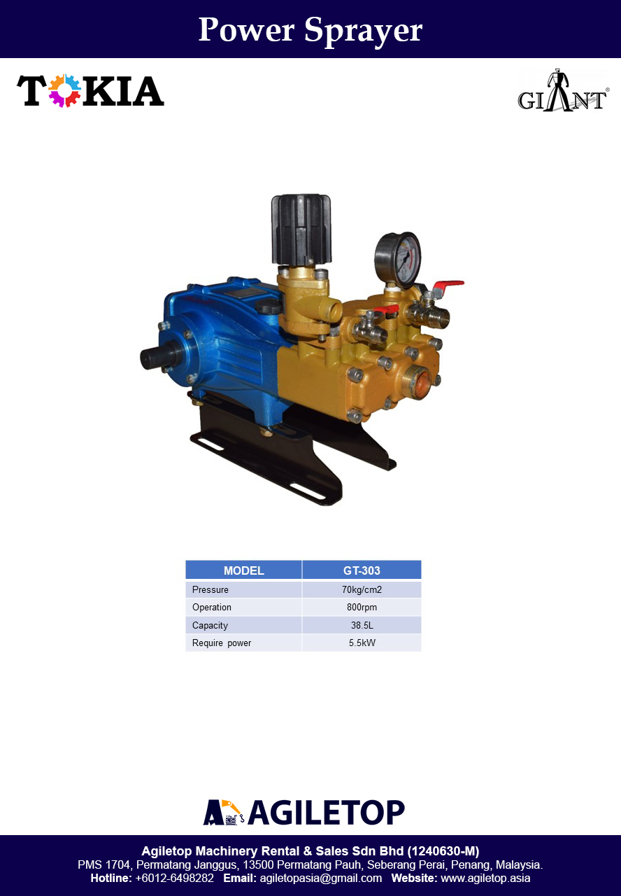 The Giant GT303 Power Sprayer is a durable and high-efficiency tool designed for effective liquid application. Equipped with a powerful engine and adjustable spray settings, it ensures consistent and even coverage for pesticides, fertilizers, and other solutions, making it suitable for both agricultural and industrial use.