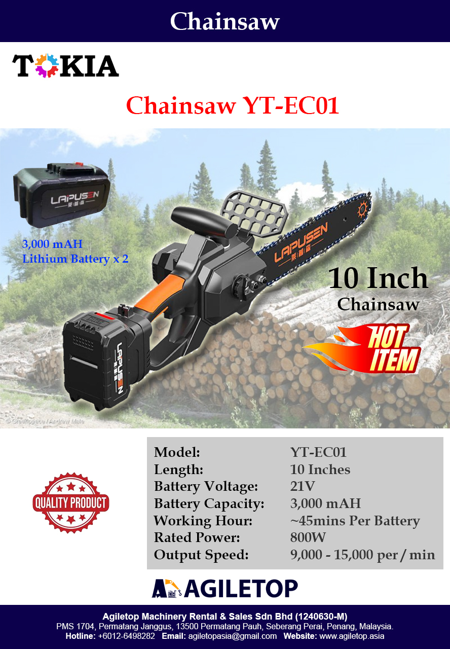 Effortlessly tackle your cutting tasks with the YT-EC01 Chainsaw. This compact and efficient chainsaw comes equipped with two 3000mAh batteries and a powerful 21V battery, providing extended run-time and reliable performance. With a 10-inch bar, it’s perfect for precision cutting and handling a variety of tasks around the yard or workshop. Enjoy a lightweight design and easy operation with this versatile tool.